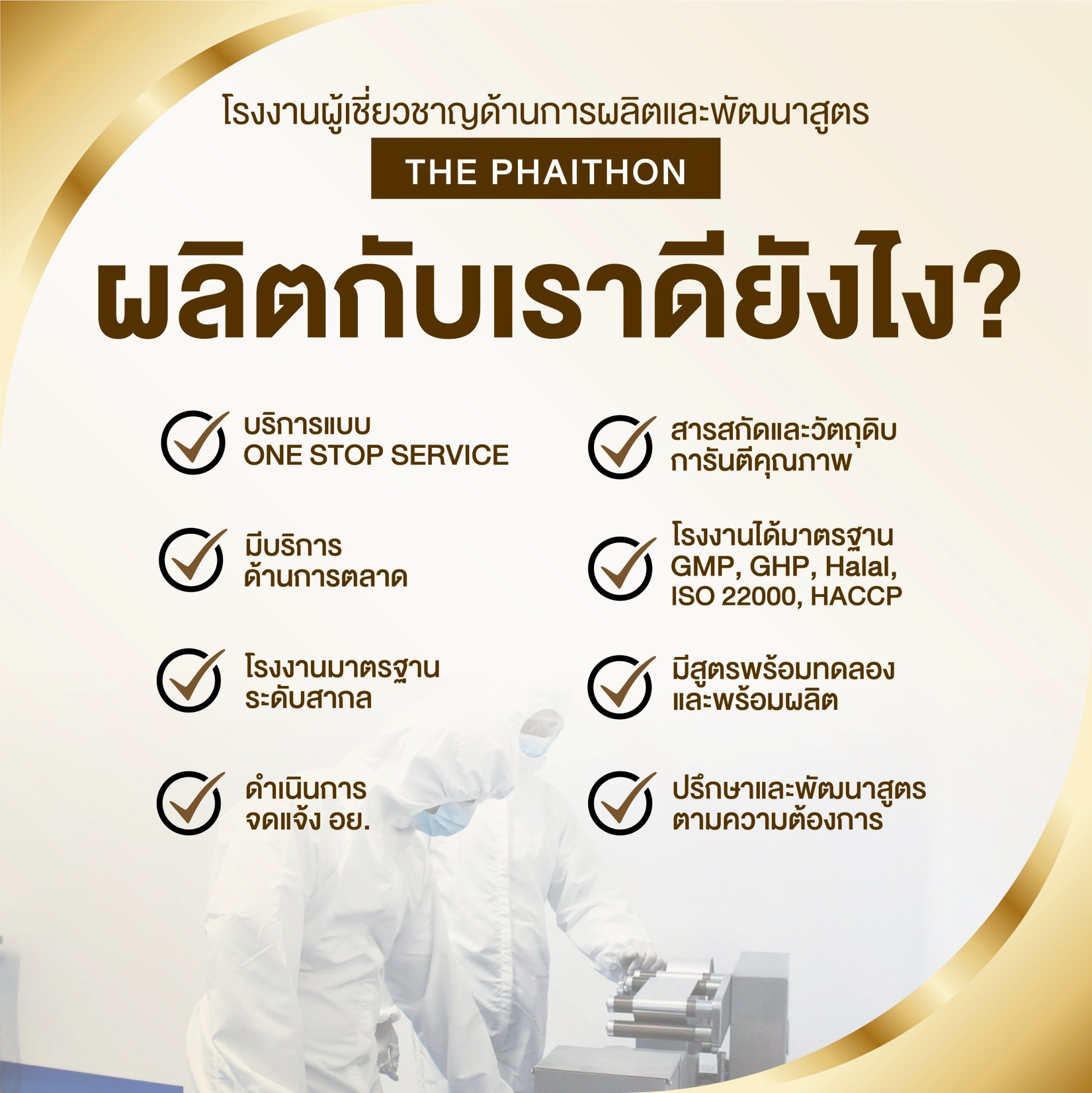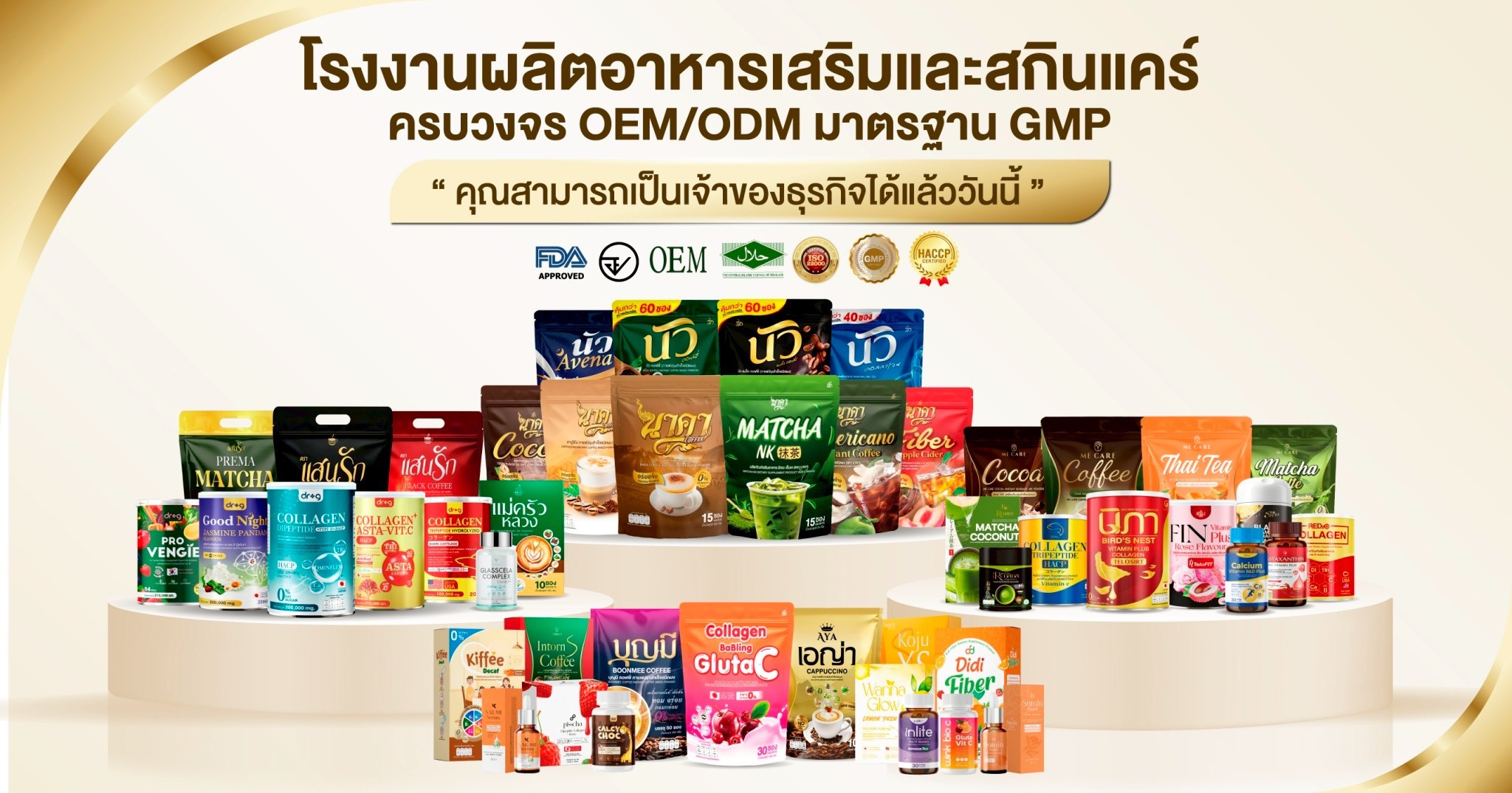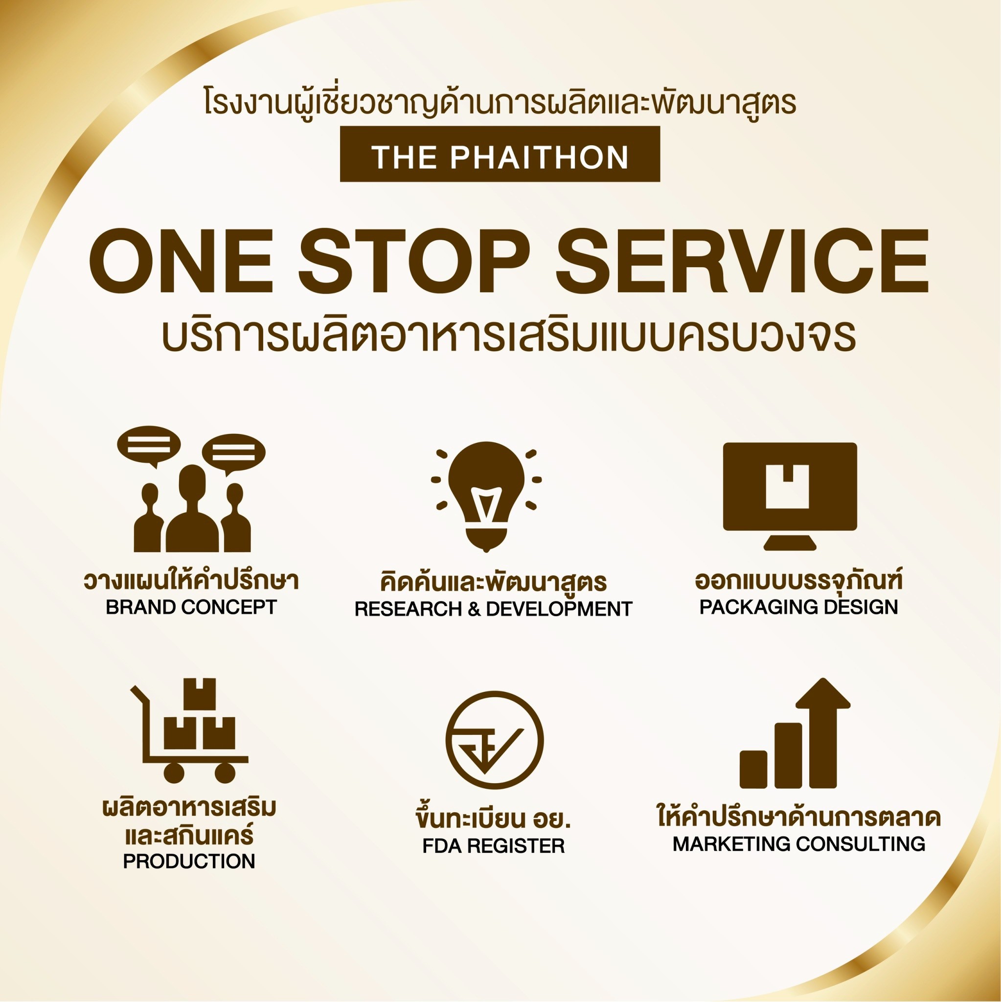 ในรูปแบบ ONE – STOP – SERVICE ที่ลูกค้าติดต่อกับเราเพียงที่เดียว ก็สามารถมีสินค้าออกขายสู่ท้องตลาดได้เราช่วยให้คุณเป็นเจ้าของกิจการแบบง่ายๆและไม่ต้องใช้ทุนมาก รับรองการผลิตด้วยมาตรฐานสากลระดับโลก GMP / HACCP / HALALจึงมั่นใจได้ว่าผลิตภัณฑ์ทุกชิ้นของเราคุณภาพสูงสุด , ปลอดภัย และใช้แล้วได้ผลจริงนอกจากนั้นเรายังให้ความสำคัญในด้านการบริการ เพื่ออำนวยความสะดวกและตอบโจทย์ทุกข้อให้แก่ลูกค้าเพื่อธุรกิจ ที่เพิ่งเริ่มจะได้ทำง่ายขึ้น