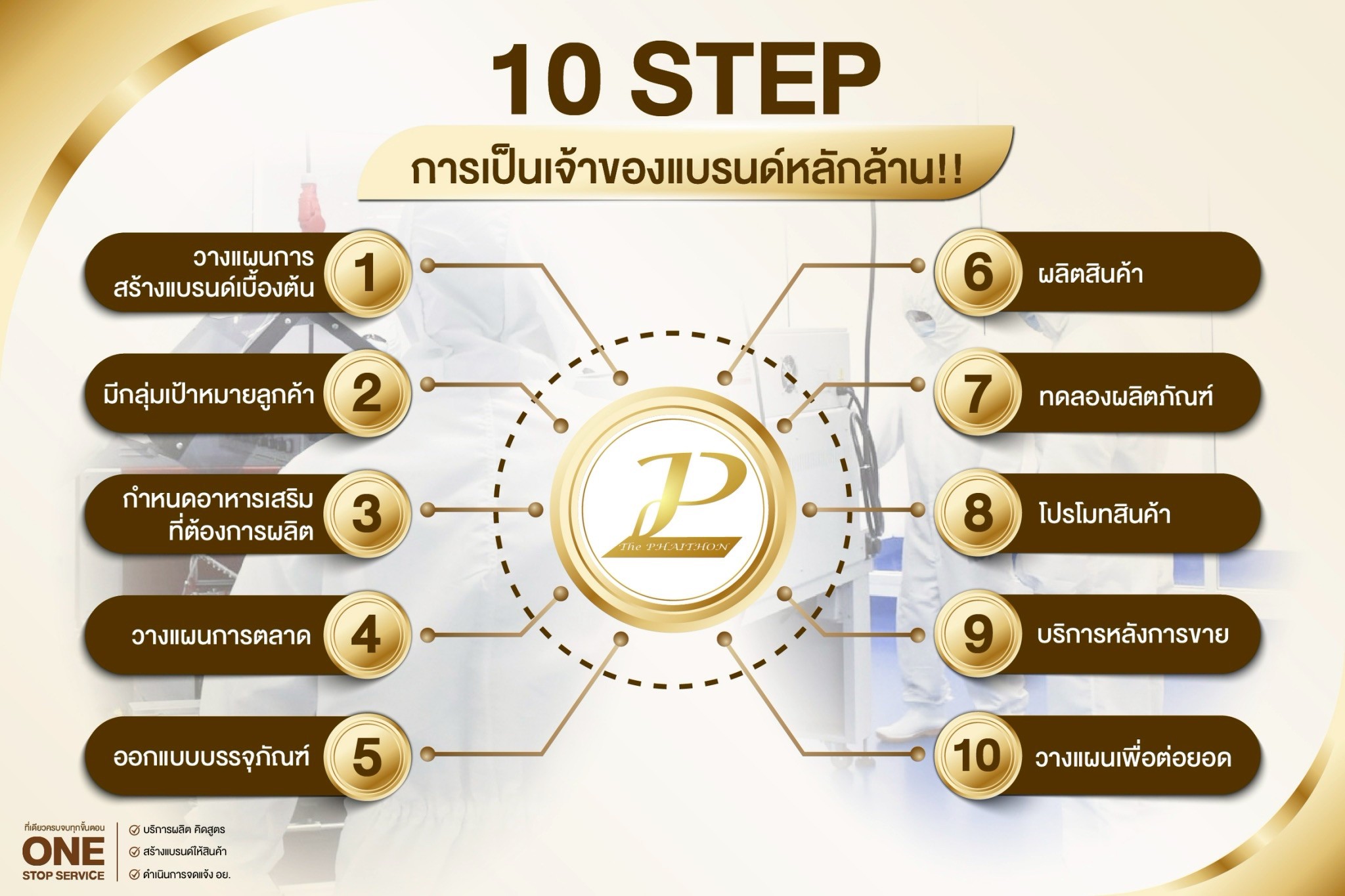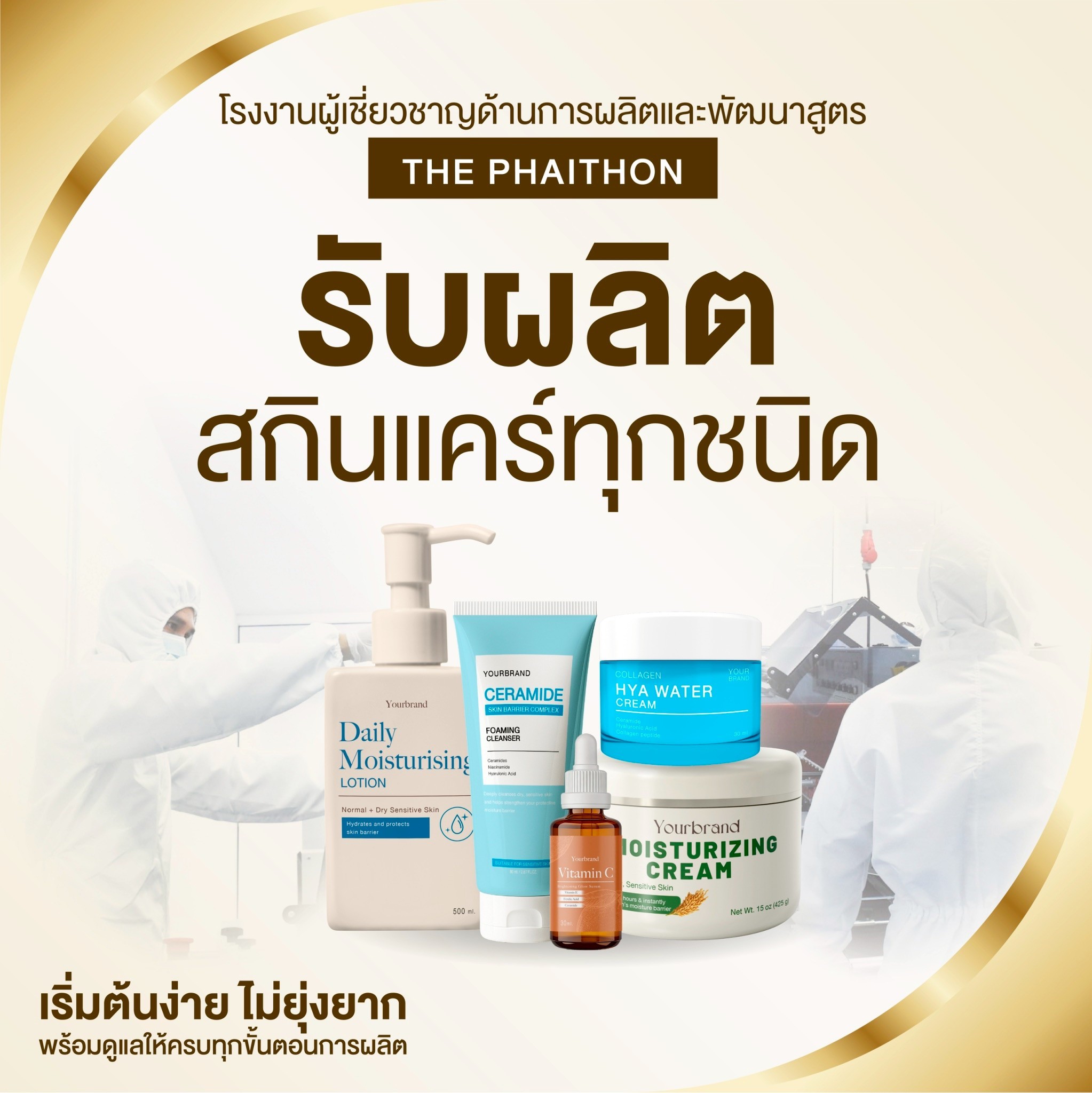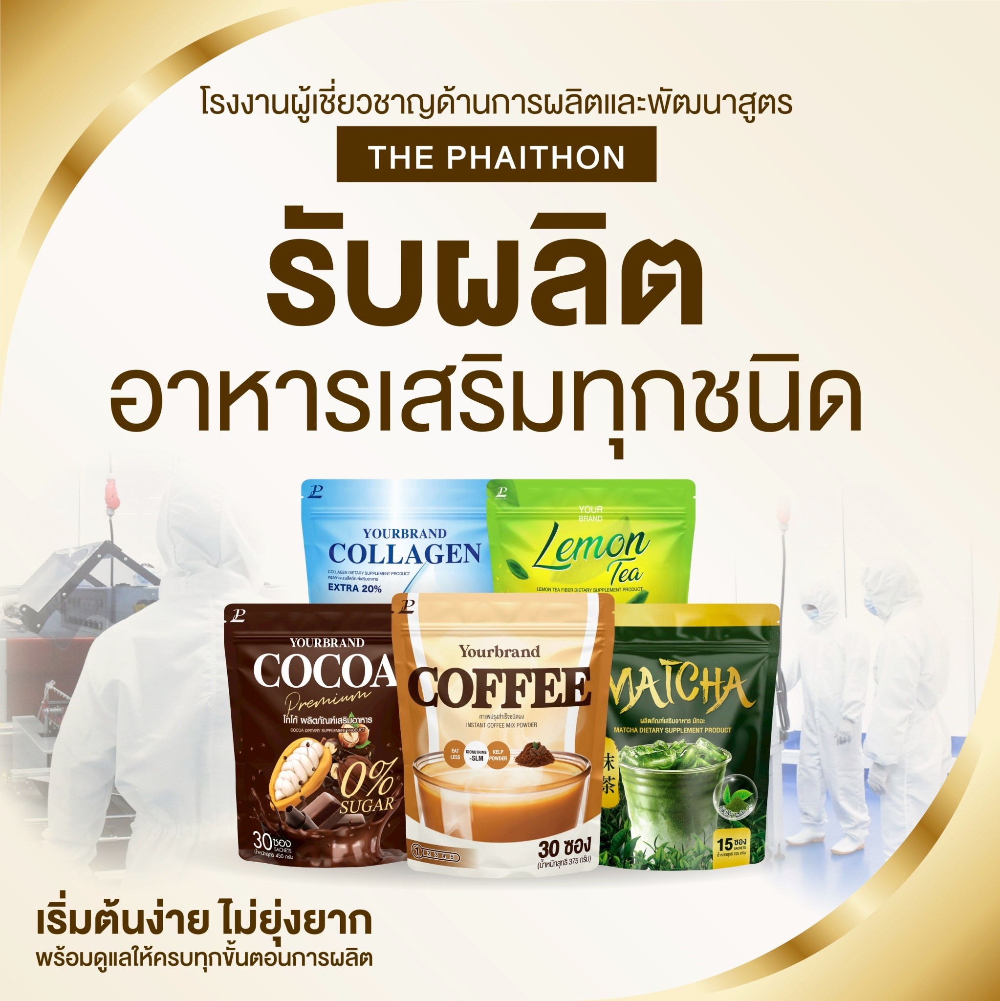 ในรูปแบบ ONE – STOP – SERVICE ที่ลูกค้าติดต่อกับเราเพียงที่เดียว ก็สามารถมีสินค้าออกขายสู่ท้องตลาดได้เราช่วยให้คุณเป็นเจ้าของกิจการแบบง่ายๆและไม่ต้องใช้ทุนมาก รับรองการผลิตด้วยมาตรฐานสากลระดับโลก GMP / HACCP / HALALจึงมั่นใจได้ว่าผลิตภัณฑ์ทุกชิ้นของเราคุณภาพสูงสุด , ปลอดภัย และใช้แล้วได้ผลจริงนอกจากนั้นเรายังให้ความสำคัญในด้านการบริการ เพื่ออำนวยความสะดวกและตอบโจทย์ทุกข้อให้แก่ลูกค้าเพื่อธุรกิจ ที่เพิ่งเริ่มจะได้ทำง่ายขึ้น